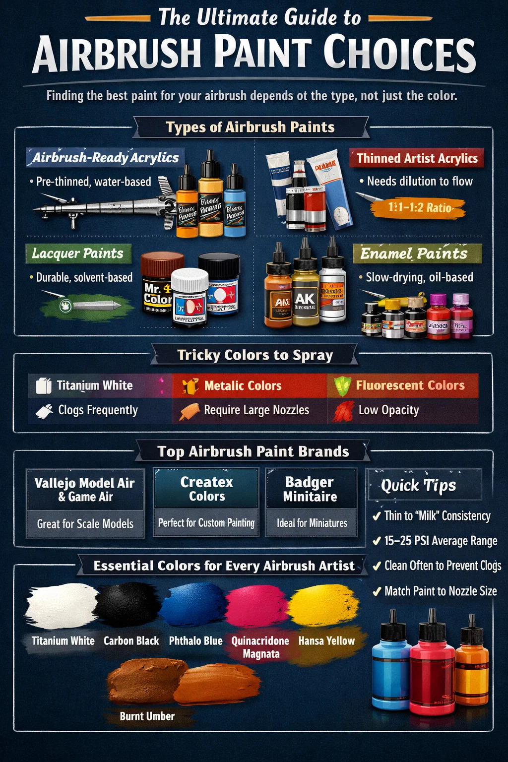 Se vuoi una risposta diretta senza deviazioni — Le vernici acriliche pronte per l'aerografo sono la scelta migliore a tutto tondo per la maggior parte degli utenti di aerografo , che tu stia dipingendo modelli in scala, scarpe da ginnastica personalizzate, torte artistiche, body painting o tele artistiche. Sono a base d'acqua, non tossici, ad asciugatura rapida e formulati con particelle di pigmento sufficientemente fini da fluire attraverso gli ugelli dell'aerografo senza intasarsi. Marchi come Vallejo, Createx e Badger Minitaire guidano questa categoria per una buona ragione.