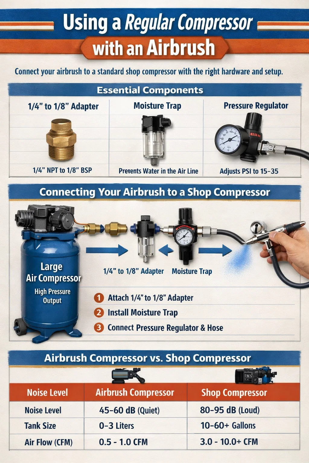 Tu è assolutamente possibile far funzionare un aerografo utilizzando un normale compressore da negozio o da garage , a condizione che si disponga degli adattatori corretti e di un modo per regolare la pressione. Mentre i compressori per aerografo dedicati sono progettati per un funzionamento silenzioso e a bassa pressione, un compressore standard su larga scala è più che in grado di fornire il flusso d’aria necessario. In effetti, molti pittori professionisti preferiscono i compressori normali perché sono loro i grandi serbatoi di stoccaggio forniscono un flusso d'aria perfettamente costante e privo di pulsazioni che i piccoli modelli di aerografo senza serbatoio spesso faticano a eguagliare.