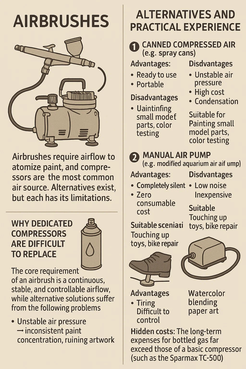 Aerografi richiedono un flusso d'aria per atomizzare la vernice e i compressori sono la fonte d'aria più comune. Esistono alternative, ma ognuna ha i suoi limiti.