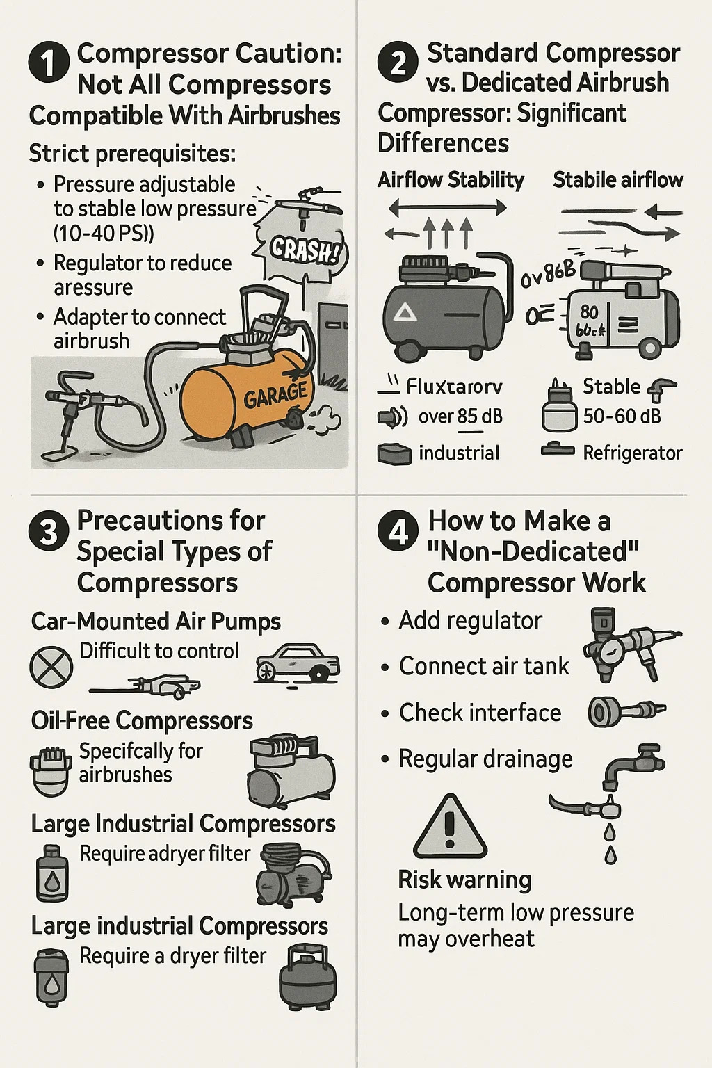 Compressori senza olio: i compressori specifici per l'aerografo sono per lo più senza olio per evitare che l'olio si mescoli con la vernice; i normali compressori che utilizzano olio lubrificante possono contaminare il canale dell'aerografo.