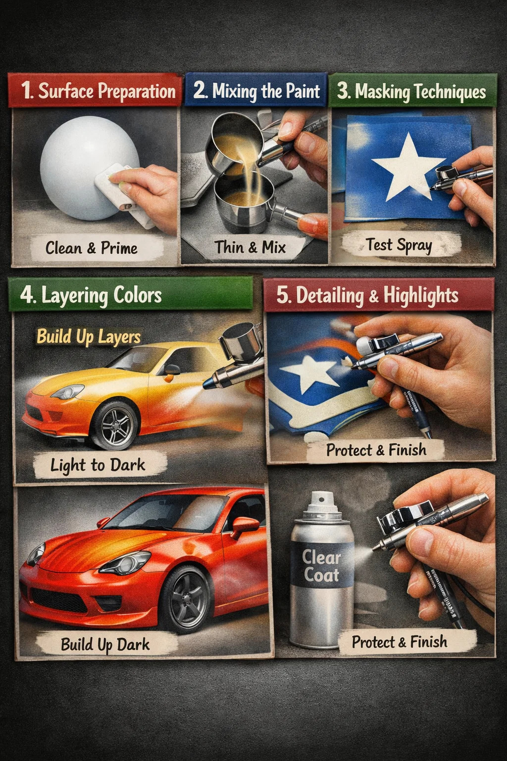 Pulizia e Protezione: Al termine, ricordarsi di spruzzare uno strato di vernice protettiva trasparente (lucida o opaca) per mantenere i colori vibranti e protetti da graffi e urti.