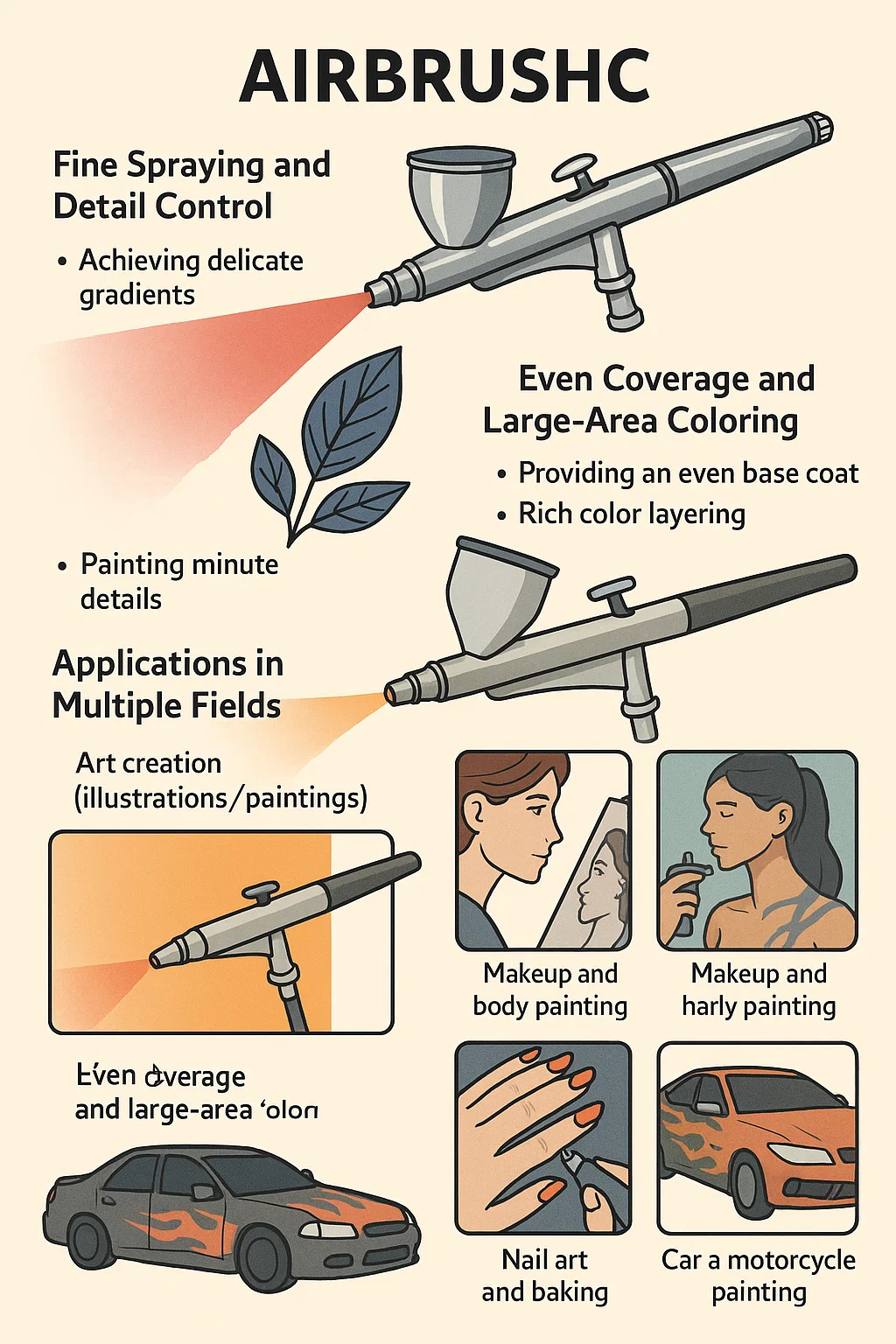 --Fornire una mano di fondo uniforme: gli aerografi possono fornire una copertura cromatica estremamente uniforme su ampie aree. Questo è più efficiente e più liscio rispetto ai pennelli tradizionali per la creazione di oggetti che richiedono una superficie impeccabile (come modellini, automobili e mobili).